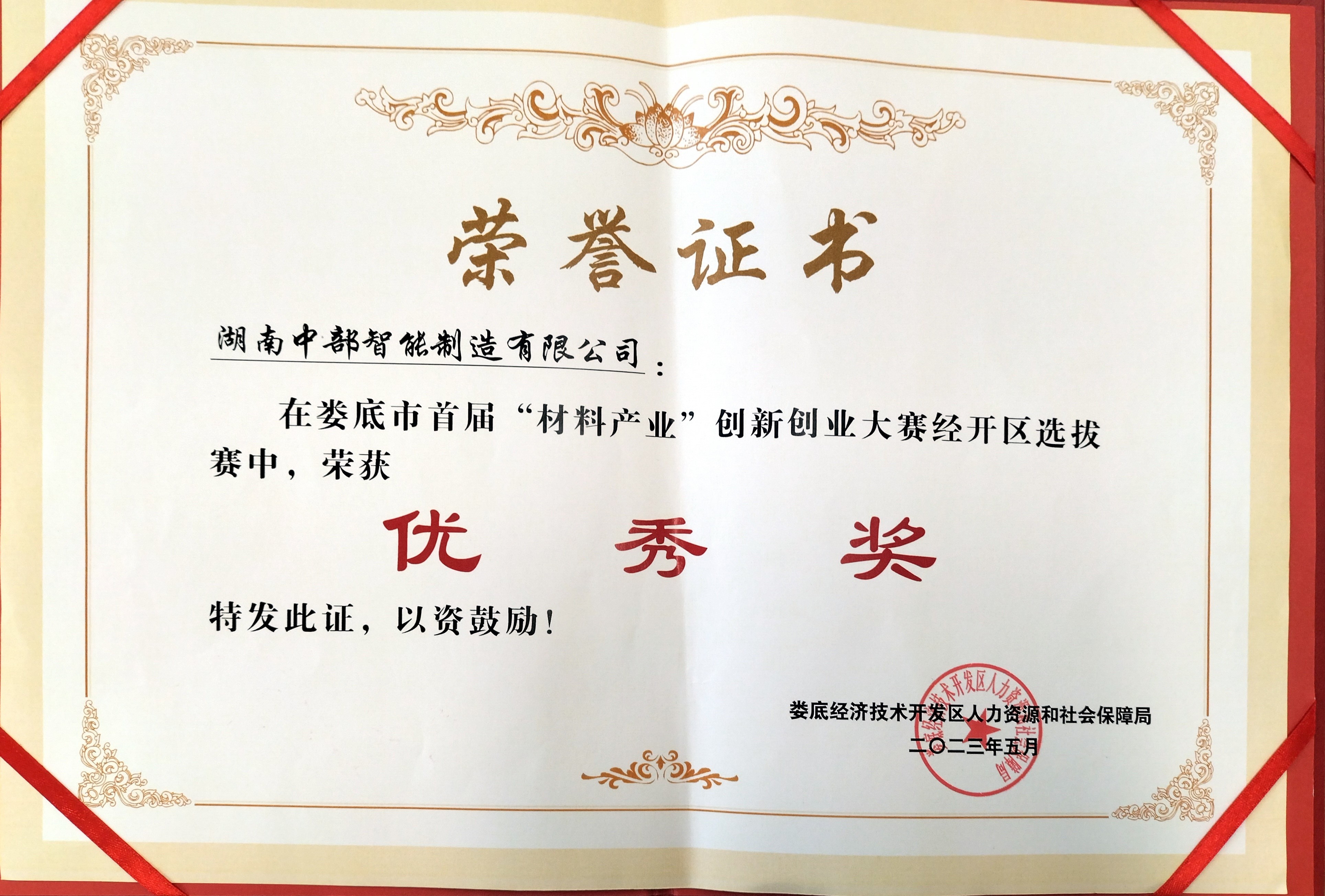 【概要描述】5月28日受经开区人社局的邀请,我司受邀参加了娄底市首届“材料产业”创新创业大赛经开区选拔赛。中部智能参赛人员通过努力贯彻敢为人先,永争一流的中钢精神,最终项目获得了优秀奖,并由政府领导颁发了荣誉证书,在中部智能的荣誉墙上再添一笔。