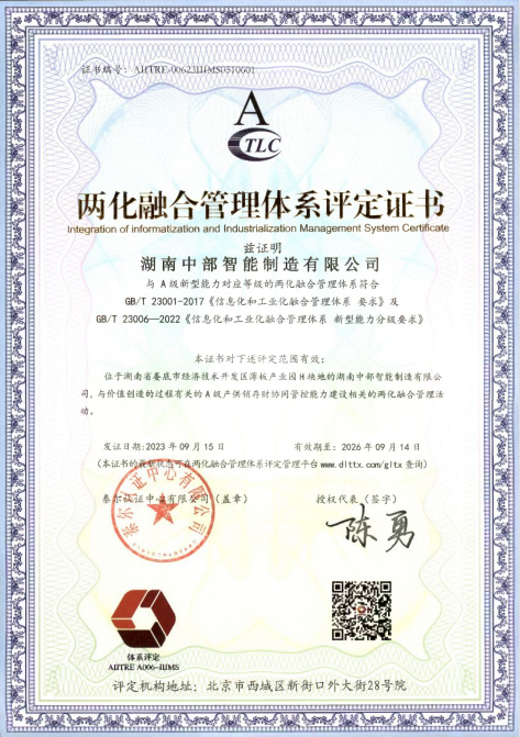 近日,湖南中钢集团旗下湖南力达工程机械制造有限公司和湖南中部智能制造有限公司顺利通过国家工业和信息化部 GB/T 23001-2017 《信息化和工业化融合管理体系要求》及GB/T23006-2022《信息化和工业化融合管理体系 新型能力分级要求》体系认证,获得两化融合管理体系A级评定证书。
