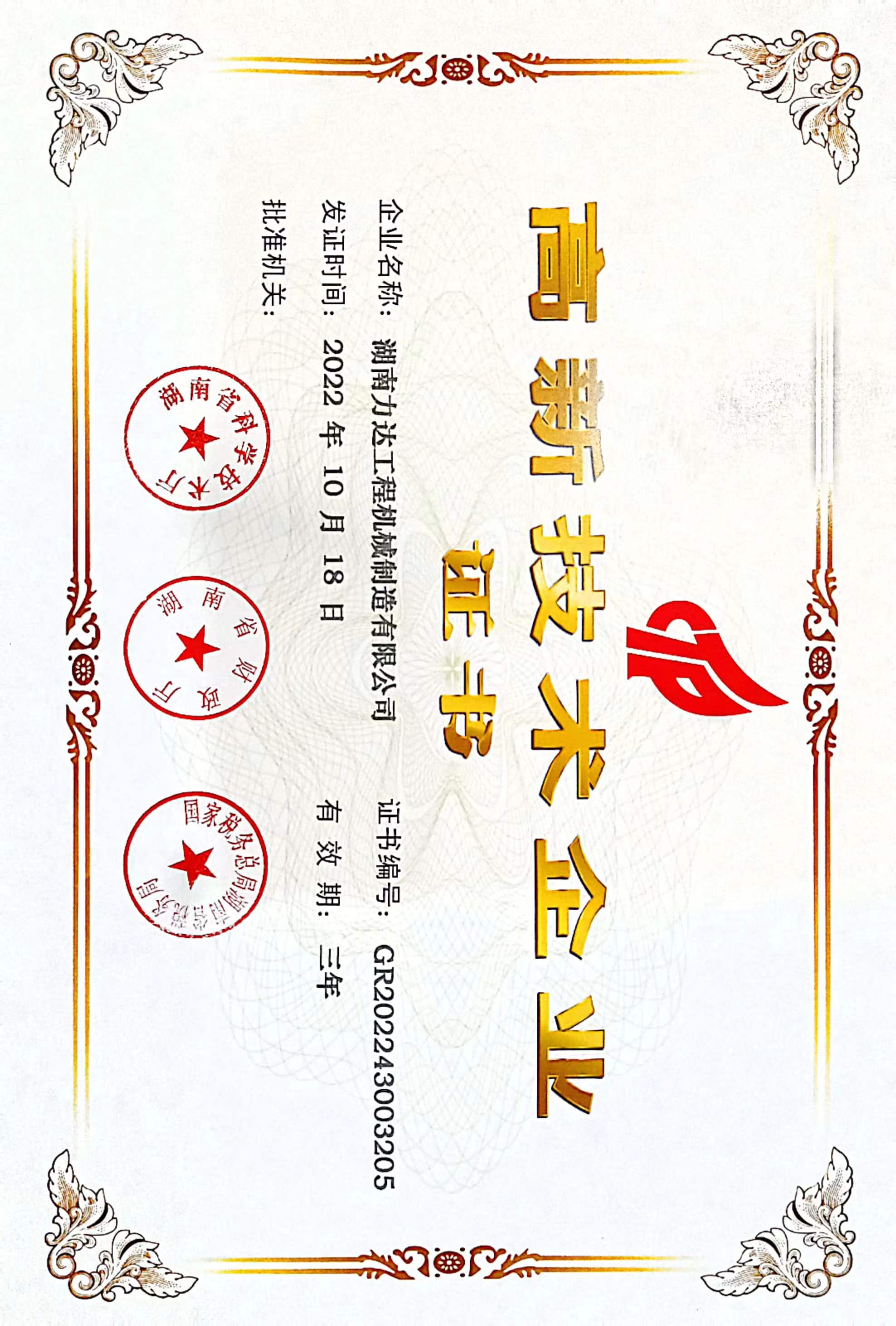 实力认可!湖南力达工程机械制造有限公司 认定为高新技术企业